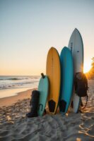 Using appropriate safety gear is essential. Wearing a leash keeps our board close, while wetsuits provide thermal protection. Helmets can prevent head injuries, especially in rocky areas. Regularly inspecting our boards makes certain they’re safe to use.